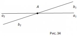 Доказательство. Пусть (a1b1) и (a2b2)- данные вертикальные углы (рис. 34). Угол (a1b2) является смежным с углом (a1b1) и с углом (a2b2). Отсюда по теореме о сумме смежных углов заключаем, что каждый из углов (a1b1) и (a2b2) дополняет угол (a1b2) до 180°, т.е. углы (a1b1) и (a2b2) равны. Что и требовалось доказать.